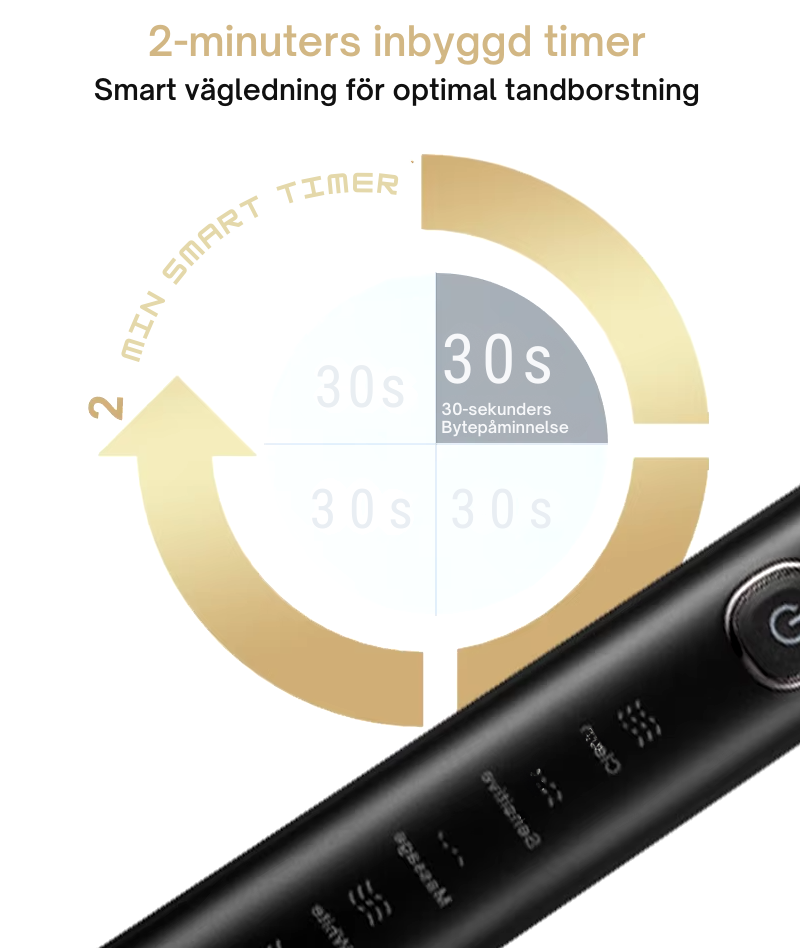 Den inbyggda smarta timern i tandborsten stannar automatiskt var 30:e sekund för att påminna dig om att byta område i munnen. Efter den rekommenderade borstningstiden på 2 minuter stängs den av automatiskt. Detta hjälper dig att utveckla goda borstningsvanor.
