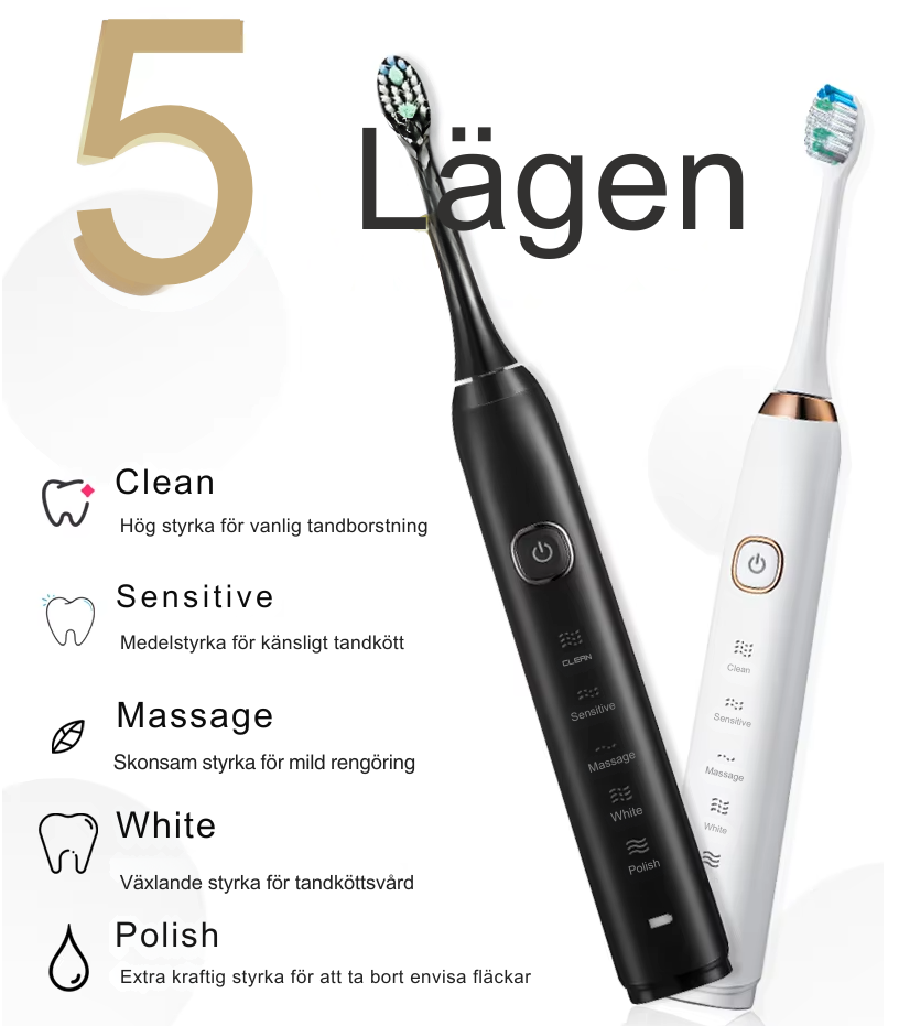 • 5 rengöringslägen: Rengöring, känslig, massage, vitare, polering